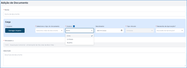 Assim no cadastramento de documentos o usuário poderá indicar o atributo “Acesso”, como indicado na figura abaixo.