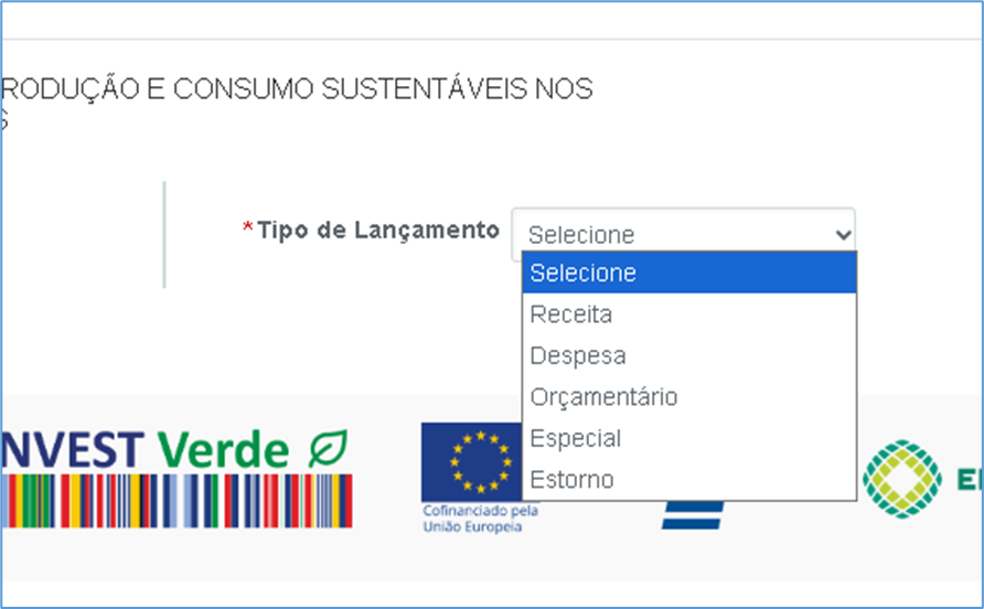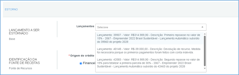 Tipo de lançamento – indicar EstornoIndique o lançamento de receita a que se refere o estorno (devolução de recursos)